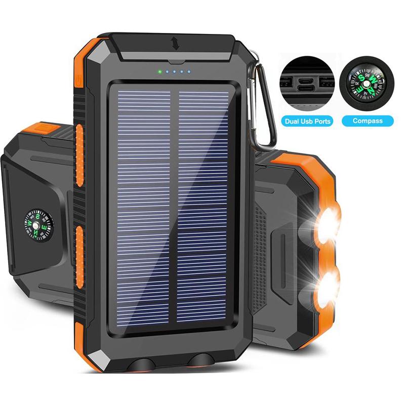 10000mAh Solar Portable Charger with Dual USB Output, LED Flashlight, Compass, and IP65 Waterproof Rating for Camping and Hiking